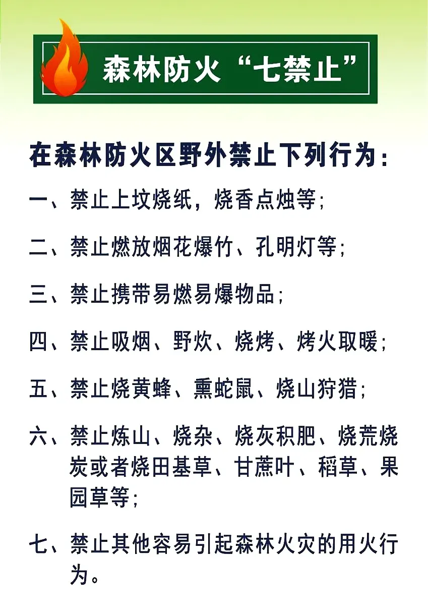 清明节是野外祭祀用火高峰,清远市林业局清城分局向广大群众敲响森林防火警钟,要严格遵守《广东省森林防火条例》第二十四条“在森林防火区野外禁止携带易燃易爆物品,禁止上坟烧纸、烧香点烛、燃放烟花爆竹”的规定,不携带火种及易燃易爆物品进山,不在森林防火区烧纸钱、燃香烛、放烟花爆竹,采用植树、敬酒、献花、放无火礼炮等方式祭祖,做到“无烟上坟,文明祭祀”,避免引发森林火灾,否则失火烧山,依法严惩。